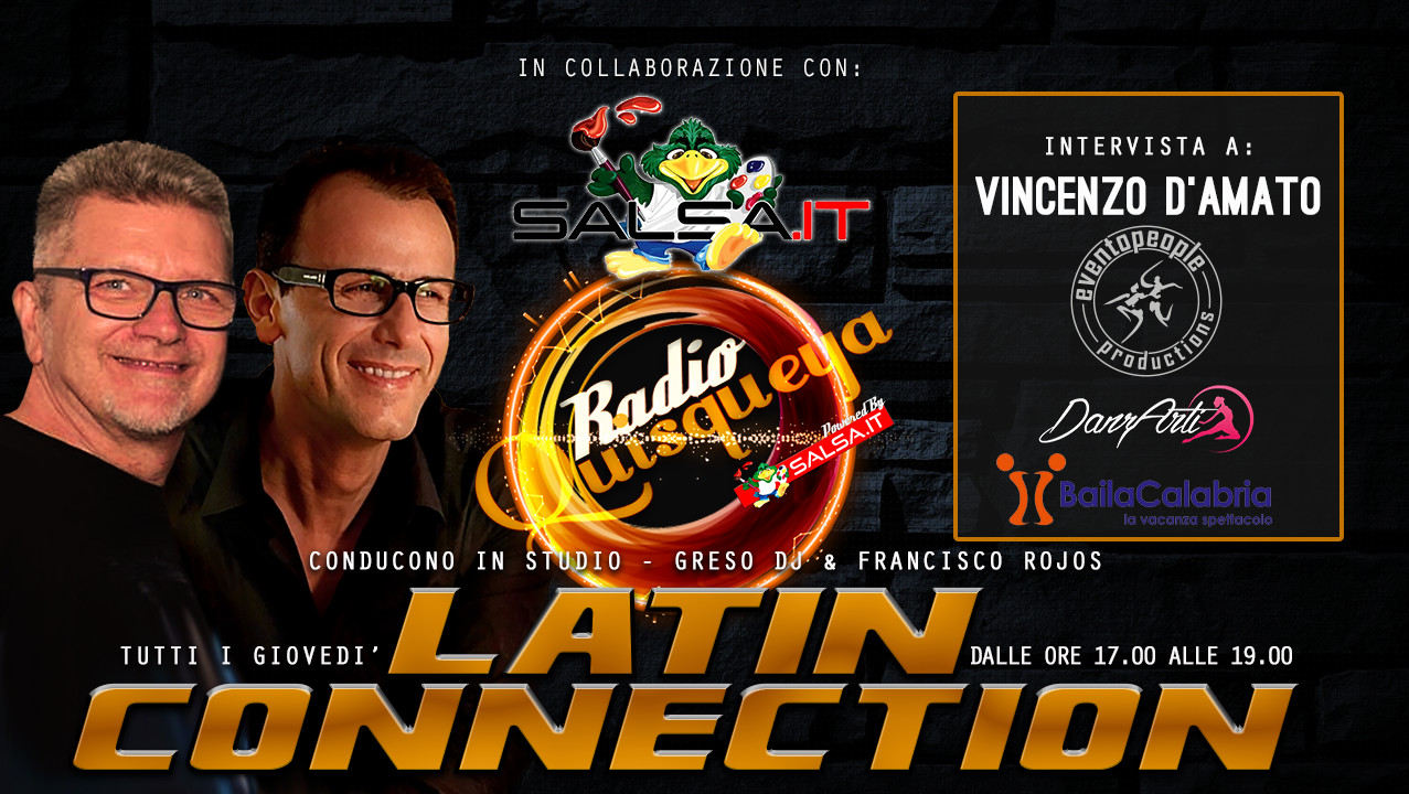 Nella puntata odierna sarà nostro ospite in collegamento telefonico Vincenzo D’Amato, senza dubbio uno dei più importanti organizzatori di eventi latini attualmente in Europa, che ci parlerà del DanzArti appena conclusosi e degli appuntamenti futuri di Eventopeople e Bailacalbria.
